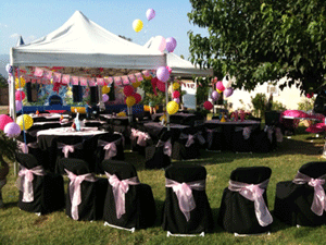 ![]() CHAIRS, BOWS & LINENS We are able to provide any color of linens & chair covers. Add a beautiful bow or overlays for your table to really accent your party. |
